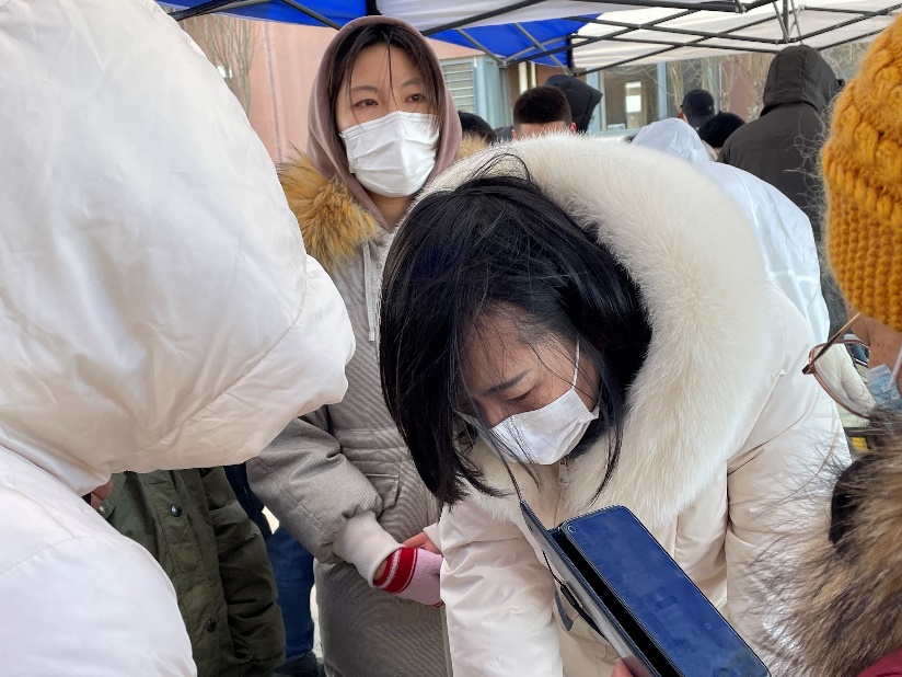 由于登记系统临时出现故障,志愿者们主动请缨,在电脑上手动为公寓居民录入身份信息,不顾严寒冻红了手指,确保居民们能减少等待时间、及时检测。