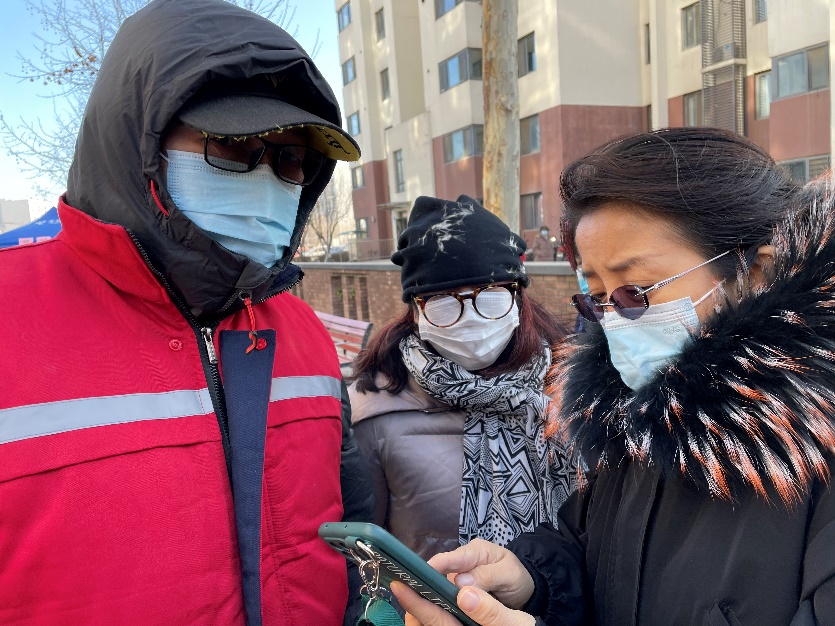 志愿者不顾严寒,认真为公寓居民进行检测登记