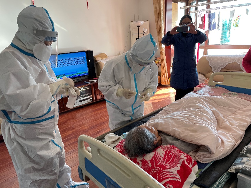 自治小组和志愿者带领医护人员为行动不便的老人上门检测。