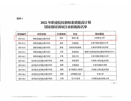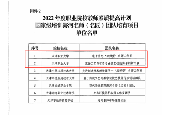 3月15日,市教委发布了《关于2022年度天津市职业院校教师素质提高计划国家级培训项目承担机构名单的公示》,beat365官网获批2022年职业院校教师素质提高计划国家级培训项目2项、海河名师(名匠)团队培育项目2项,分别是课程实施能力提升项目(商管文教)、公共基础课教学能力提升项目(公共基础课)、电子信息“双师型”名师工作室、烹调工艺与营养专业技艺技能传承创新平台。