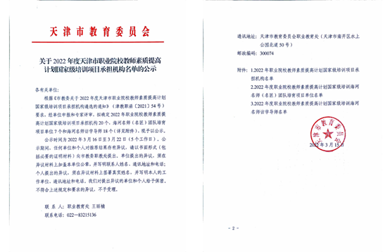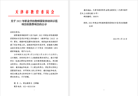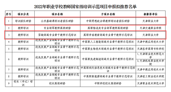 3月24日,市教委发布了《关于2022年职业学校教师国家级培训示范项目拟推荐项目的公示》,拟推荐天津市7所院校9个子项目参与教育部遴选,beat365官网成功入选2项,分别是中职思想政治课教师培训者团队研修、高职学前教育领域专业骨干教师示范培训。