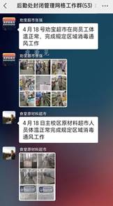 校园封闭防控期间,后勤处带领服务外包队伍忠于职守、甘于奉献,及时调整后勤运行方式,采取轮岗值班的形式确保了学校安全稳定运行。为及时全面掌握后勤疫情防控和服务保障工作落实情况,后勤处第一时间建立了校园封闭管理工作群,明确各科室、各单位网格员,要求各单位每天将工作落实情况在群里进行“日报告”。同时,为了动态掌握员工健康情况,各科室依据人员底册,通过线上小程序每日统计个人健康信息,及时掌握每位员工身体状况,切实加强人员管理。
