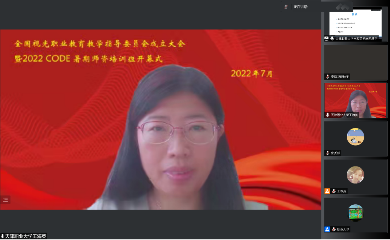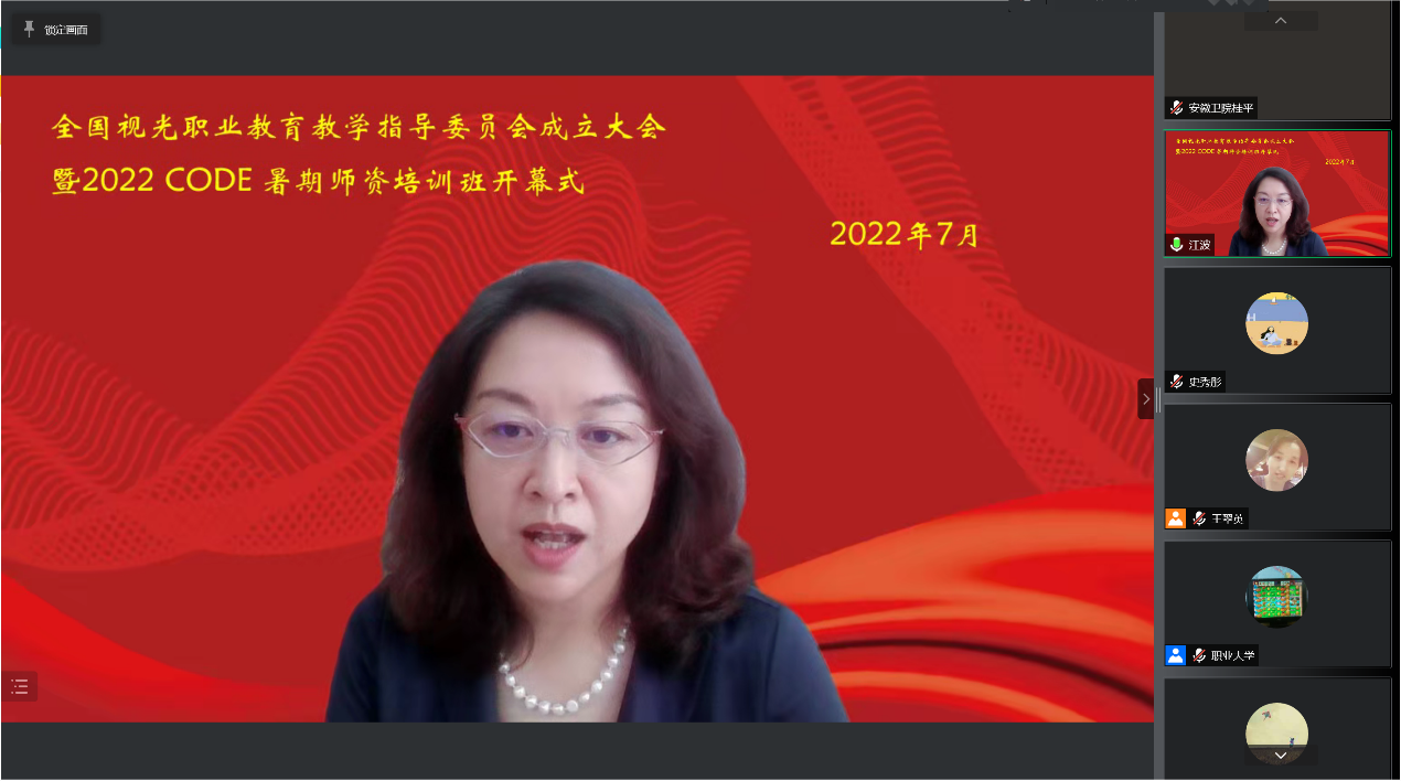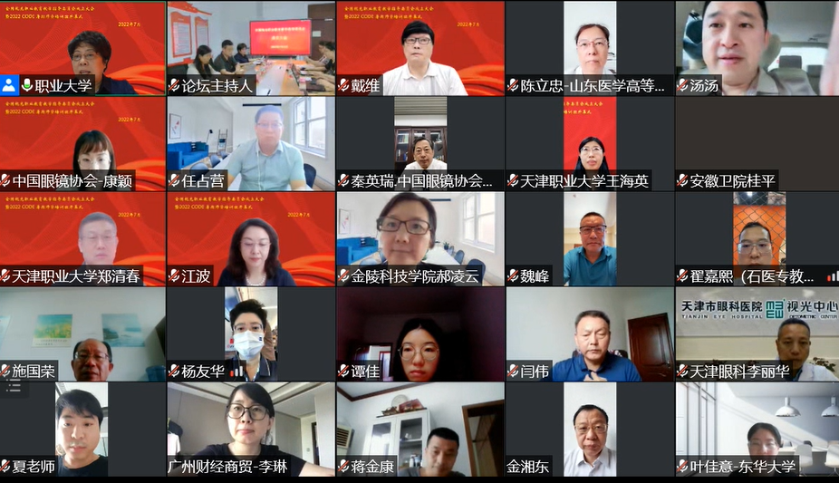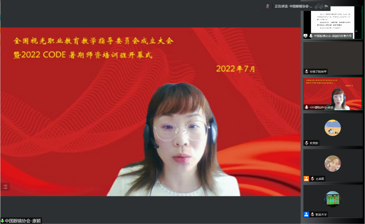 2022年7月15日上午,全国视光职业教育教学指导委员会成立大会暨2022年CODE暑期师资培训开幕式以线上方式召开。中国轻工业联合会副会长、中国眼镜协会理事长杜同和,教育部职成司职业院校发展处处长任占营,beat365英国官方网站党委副书记、校长郑清春出席并讲话。视光行指委主任委员、中国眼镜协会职业副理事长兼秘书长戴维平、中国眼镜协会驻会副理事长江波等出席会议。视光行指委委员以及参加CODE暑期师资培训的视光专业教师共148人参加了会议。大会由视光行指委副主任委员、beat365英国官方网站副校长杨荣敏主持。