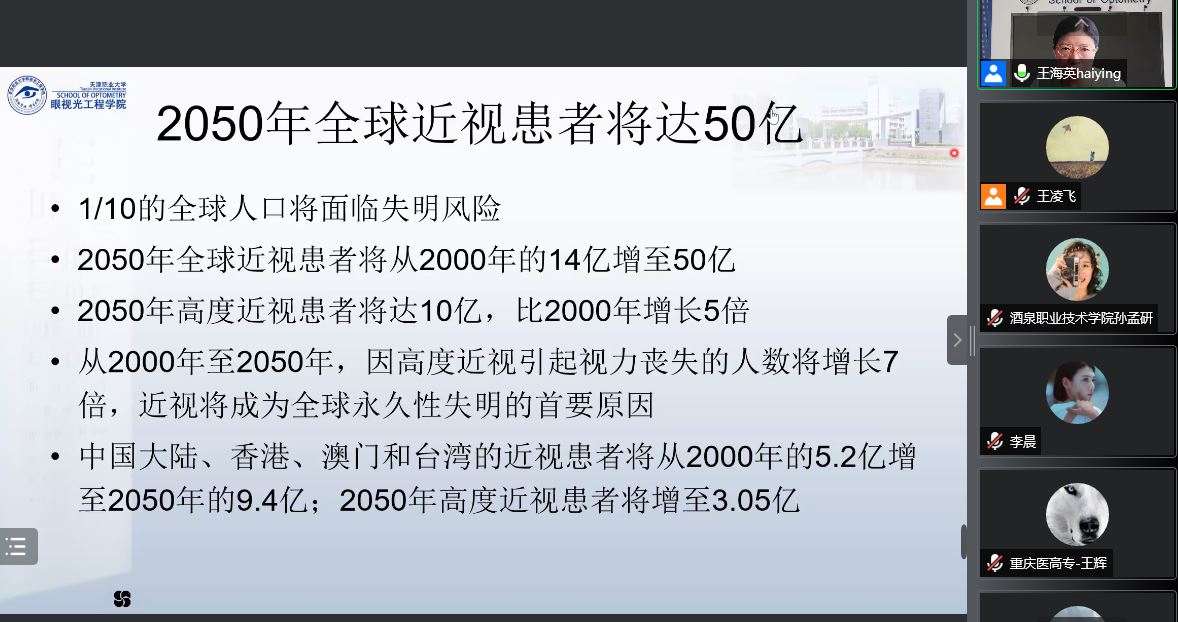 7月16日下午,视光行指委副秘书长、beat365英国官方网站眼视光工程学院院长王海英教授带来了《近视防控的进展》的讲座,深入浅出地介绍了目前近视防控的各种手段及研究进展,内容丰富。