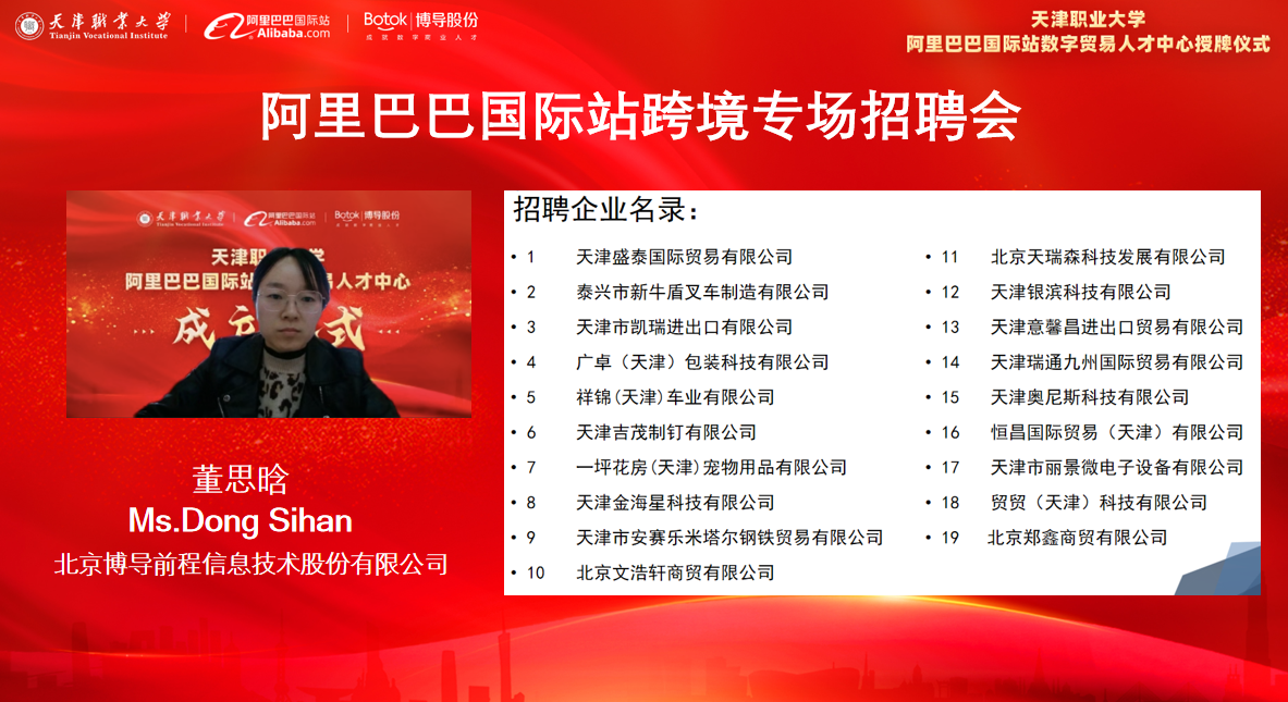 beat365英国官方网站阿里巴巴国际站数字贸易人才中心的成立标志着beat365官网产教融合、校企合作结出了又一颗丰硕的成果。此次线上招聘会也是经管学院落实教育部第一期供需对接就业育人项目、确保应届毕业生实现高质量就业和充分就业的关键举措,有效推进了跨境电商人才培养与就业的有机联动和人才供需的有效对接,为社会输送更过优质跨境电商人才,助力天津经济发展。