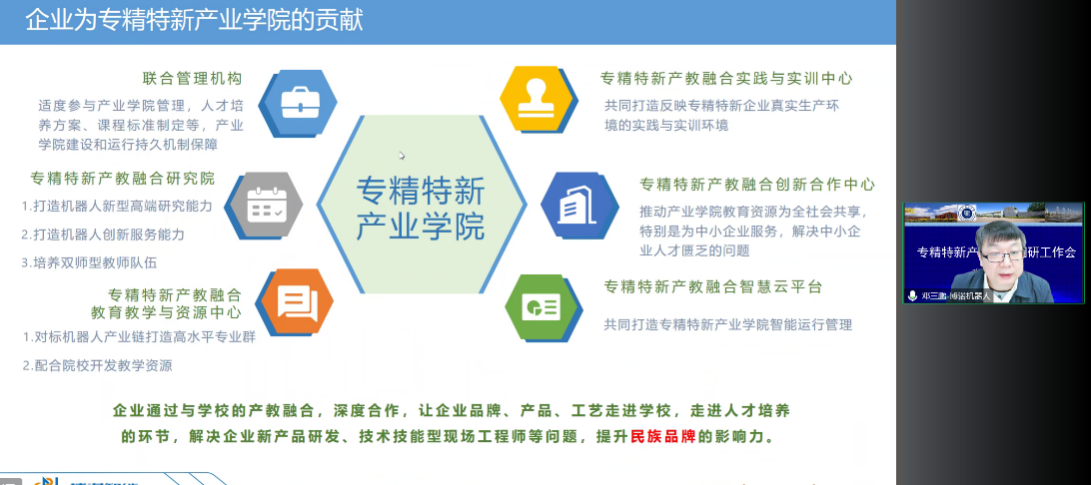 联合申报企业天津博诺智创机器人技术有限公司邓三鹏教授介绍了企业与beat365官网机电学院产教融合建设情况及后期专精特新智能机器人产业学院建设设想。天津市工艺管理协会会长唐贺增从协会对专精特新产业学院建设将提供的支持内容做了现场分享。