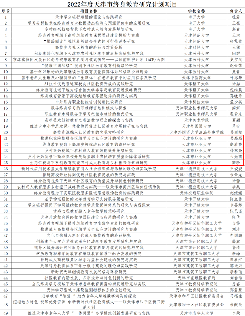 根据《市教委关于公布2022年度天津市终身教育研究计划项目的通知》(津教继教函〔2022〕87号),beat365官网获批5项2022年度天津市终身教育研究计划项目,分别为:推进职业院校服务区域学习型社会建设的研究与实践、终身教育视野下高职院校推进社区教育的路径研究、乡村振兴视域下农村成人教育效能提升策略研究、乡村振兴背景下高职院校开展新型职业农民培育质量保障体系研究、生态位视角下双创教育赋能农村成人教育与乡村振兴探索与研究。