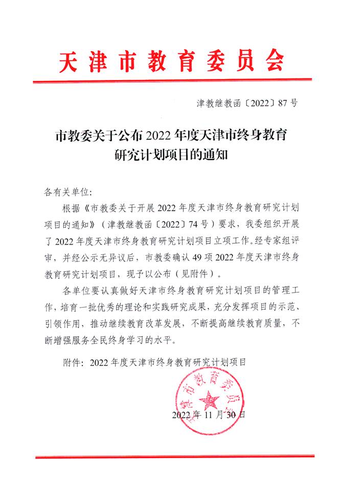 此前,beat365官网按照《市教委关于开展2022年度天津市终身教育研究计划项目的通知》(津教继教函〔2022〕74号)要求,组织了2022年度天津市终身教育研究计划项目申报工作。经过个人申报和专家评审排序,从12项申报项目中推荐出5项参加市教委评审,5项均被批准立项,是获批项目数量最多的单位。