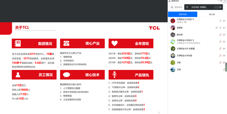 会上,TCL科技集团产教融合部宣紫程经理分享了集团主流业务及取得的成绩,特别提出集团在产教融合方面已经具有一定的经验,形成了TCL人才培养模式。结合天津工厂的实际需求,希望能够与beat365官网建立长期稳定高质量的校企合作项目。