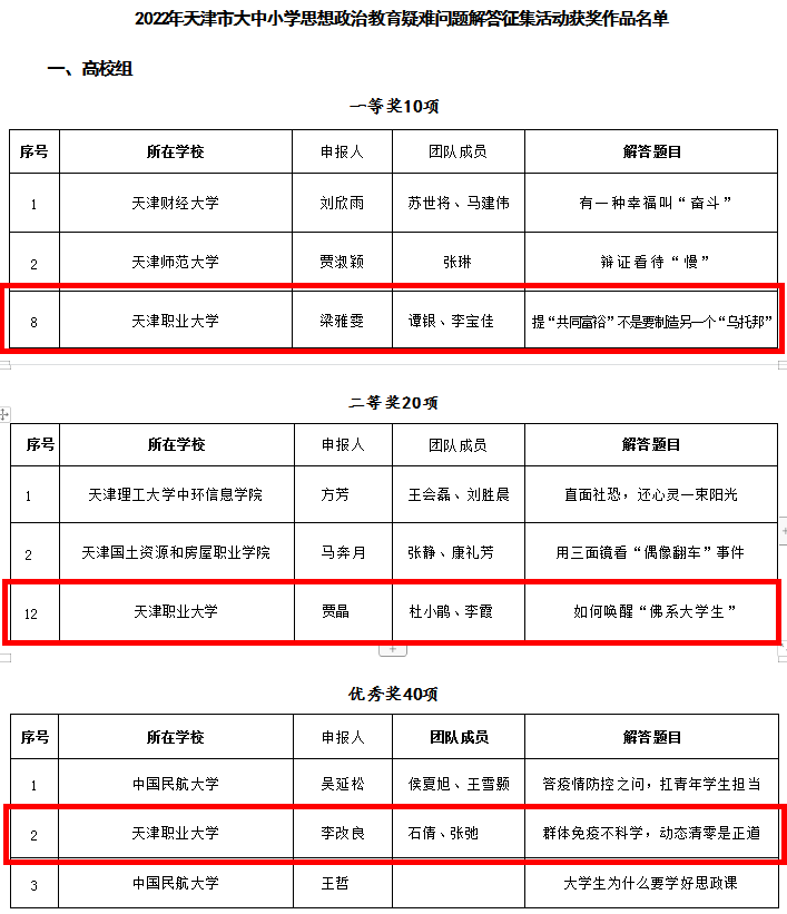 在天津市委教育工委、市教委组织开展的2022年度天津市大中小学思想政治教育疑难问题解答征集活动中,beat365官网马克思主义学院教师梁雅雯团队荣获一等奖,贾晶团队荣获二等奖,李改良团队荣获优秀奖。