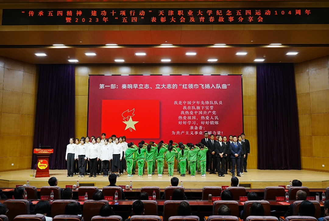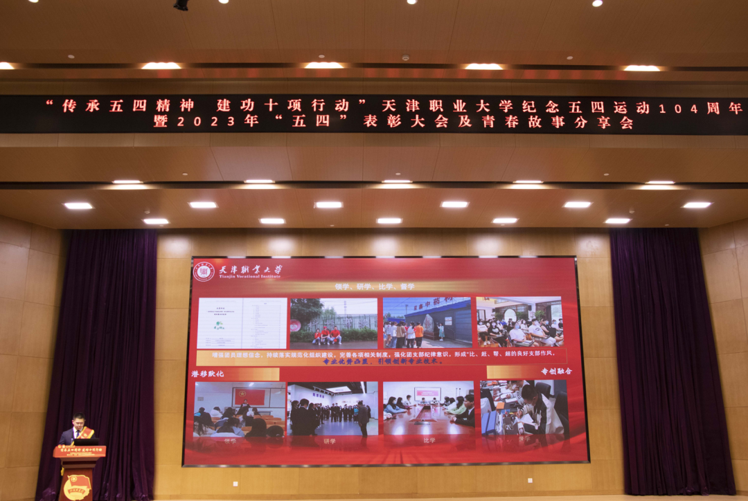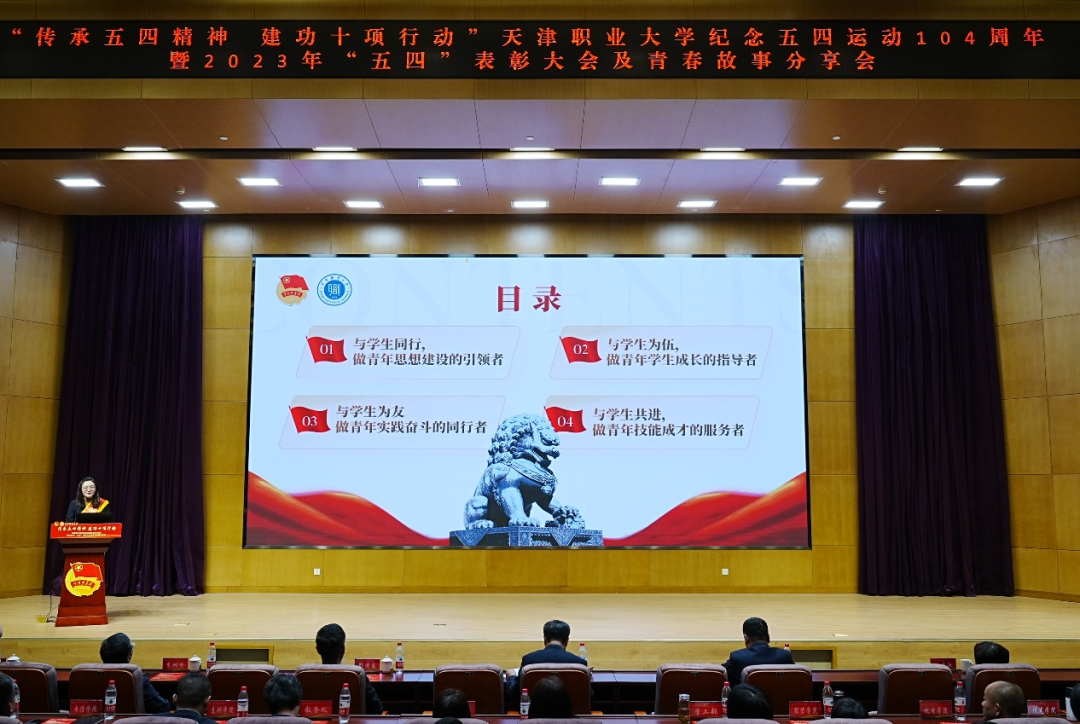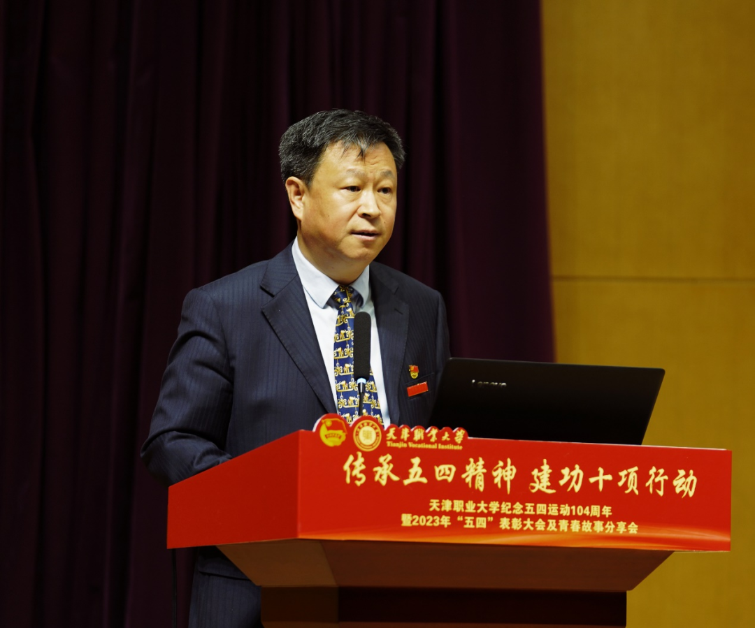 五月的鲜花在光荣与梦想中绽放,信仰的旗帜在奋斗与拼搏中飘扬。为纪念五四运动、铭记光辉历史、传承红色基因、表彰青年先进,5月6日下午,“传承五四精神 建功十项行动”beat365英国官方网站纪念五四运动104周年暨2023年“五四”表彰大会及青春故事分享会在图书馆报告厅隆重召开。校党委书记夏静波出席并讲话,校党委副书记、校长郑清春,副校长刘石英,副校长李树岭,副校长杨荣敏,纪委书记唐勇出席大会,相关职能部门负责人、各学院领导、全体教师团干部、青年师生代表,以及天津市大、中、小学思政课一体化共建单位小淀小学师生代表共400余人参加了此次活动。