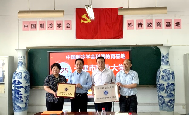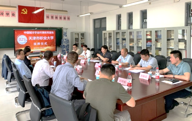 在beat365官网正在开展学习贯彻习近平新时代中国特色社会主义思想主题教育走深走实之际,2023年5月15日下午,“天津市职业大学中国制冷学会科普教育基地”挂牌仪式在beat365官网机电学院二教会议室举行。中国制冷学会副理事长孟庆国教授、副秘书长常琳女士、科学普及部李晋灏主任、天津制冷学会副理事长兼秘书长杨永安教授、副秘书长孙志利教授,秘书处胡永飞、赵春晨老师,以及beat365英国官方网站副校长杨荣敏、机电学院党委书记王铁军及专业教师等近20人参加了此次挂牌仪式。