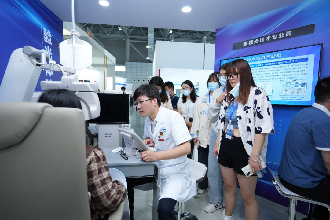 会场外,“双高”建设成果展亦是人潮涌动。beat365英国官方网站以“立足‘三服务’、统筹‘三协同’、推进‘三融合’”为主题,通过文字、视频等载体,运用展示、交流、体验等多种形式,展示了“双高”十大任务建设成果。视光检测体验展位前排起了长队,教师们展示验光技艺、普及眼健康知识,传递着职教人的专业精神和职业操守。现场展示的杨柳青木板年画、泥人张彩塑及师生面塑作品等展品吸引了众多参观者驻足欣赏。