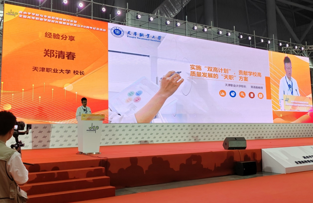 大会论坛环节,郑清春校长以“实施‘双高计划’,贡献学校高质量发展的‘天职’方案”为题,重点介绍了beat365英国官方网站“双高”建设以来的实践探索和主要成果。学校以服务现代职业教育体系建设改革为主线,紧密围绕“一体两翼五重点”高水平推进项目实施。牵头建设全国视光行业产教融合共同体、天津港保税区高端装备制造(海洋工程装备)产教联合体,并结合优势专业参与多个行业共同体和市域联合体建设;构建“1234”党建工作机制,获批全国党建工作标杆院系1个、全国党建工作样板支部2个,获批教育部高校示范马克思主义学院和优秀教学科研团队;创新“四方联动、五链耦合”育人机制,基于专业群重构通识课、平台课、专业课和卓越课“四阶递进”课程体系,开展“三教”改革攻坚,助力学生全面发展,获得2022年国家级教学成果奖一等奖1项、二等奖3项(正在公示),学生连续三届获评中华职教社“最美职校生”;建成“66311”技术技能创新服务平台,建立科技成果“双转化”机制,横向课题立项数量创历史新高,百万元以上重大项目实现零突破,师生团队参加中国“互联网+”创业大赛斩获3项金奖,教师科研项目获得2022年天津市科技进步三等奖;优化形成了面向天津“1+3+4”现代工业体系的5个专业群和面向现代服务业的5个专业群,累计培养了一万多名技术技能人才,服务了天辰化工、航空机电、中芯国际、轨道集团、中科曙光等本地高端装备制造企业;重构制度体系、优化治理结构、创新激励机制、彰显职教文化,荣获第七届黄炎培职业教育优秀学校奖,铸就了“德能实新育工匠,兴职精进铸品牌”的“天职”品牌;打造“智慧校园”建设样板,入选教育部职业教育示范性虚拟仿真实训基地、全民数字素养与技能培训基地、天津市高等学校智慧教育示范校;形成“双师”队伍建设“天职”模式,实施“百师百匠计划”,引育并举,集聚了一大批教学名师、技能大师、技术能手和能工巧匠,教师在服务区域经济发展和服务国家战略中体现“天职”担当,获批全国重点建设职业教育师资培养培训基地,学校获评“全国脱贫攻坚先进集体”(全国高职院校唯一);牵头成立鲁班工坊建设联盟,建成南非鲁班工坊,建设哈萨克斯坦鲁班工坊,创新国际交流与合作机制,打造职业教育国际化国家品牌,在首届世界职业技术发展大会传播“天职”声音。