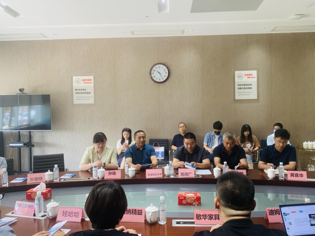 在敏华控股天津家具分公司,政企校三方开展了座谈和交流。武清区人社局二级调研员施德广首先向各参会学校教师介绍了武清区人社局在企业见习基地、用工推荐等方面的政策。生环学院党委书记郝志刚对武清区人社局和武清开发区为园区企业和各职业院校搭建沟通交流平台表示了感谢,对生环学院的专业特色、学院的师资、在培训和科研方面的和优势进行了介绍。就会上敏华控股天津家具分公司、天津海纳精益科技有限公司、天津华创瑞风空调科技有限公司、未来已来(天津)科技发展有限责任公司、天津迪姆医疗科技有限公司、天津娃哈哈食品有限公司等企业代表提出的人才招聘、员工培训、校企合作等问题方面的需求,校企双方代表就这些方面进行了深入的交流。