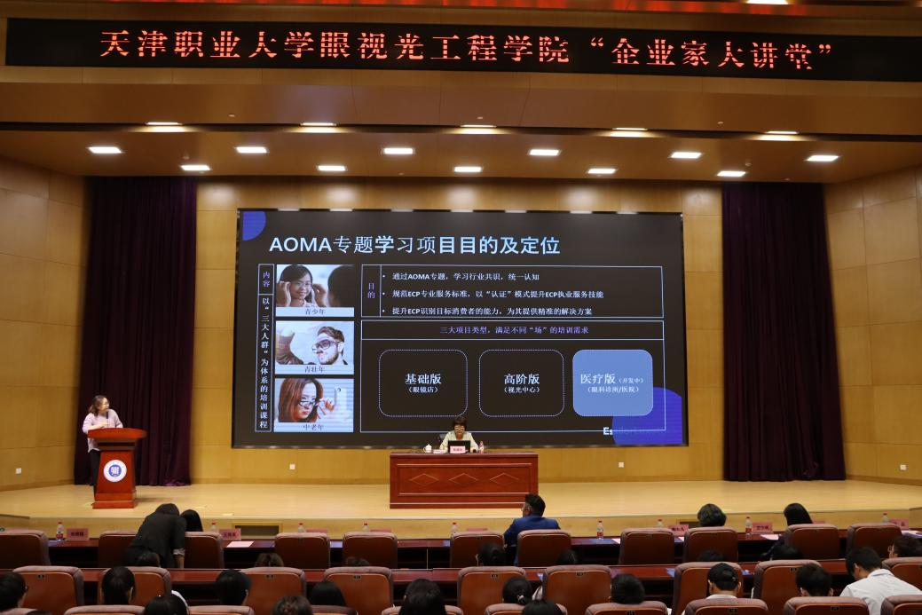 签约仪式前,依视路陆逊梯卡集团大中华区公共事务副总裁陈路怡女士以“中国视光师的职业发展展望”为题,陆逊梯卡集团大中华区专业视觉健康业务总裁林国樑先生以“中国眼视光产业发展趋势及面向未来的领导力需求”为题分别为眼视光工程学院师生开展了精彩的“企业家大讲堂”,期间依视路陆逊梯卡集团专业教育经理傅婷女士对AOMA视光认证课程做了详细介绍,并与学生交流互动。