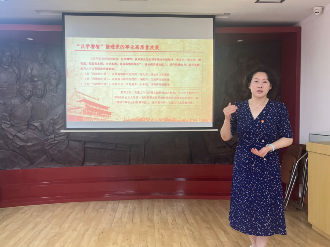 活动伊始,德法课教研室党支部书记叶浩林同志作了题为“百年初心不忘,赓续红色血脉;以学增智提能,促高质量发展”的党课。党课从“为民请愿—为被压迫人民谋幸福”“为国当歌—以挽救民族危亡为己任”“逐光而生—用马克思主义思想启蒙民众”“放眼天下—为人类进步事业而奋斗”四个部分为大家介绍了觉悟社的创办意义和精神内涵,并号召大家“以学增智”,提升政治能力、思维能力和实践能力,推进党的教育事业高质量发展。随后,薛媛同志就《习近平在中共中央政治局第五次集体学习时强调 加快建设教育强国 为中华民族伟大复兴提供有力支撑》等内容进行了领读领学。