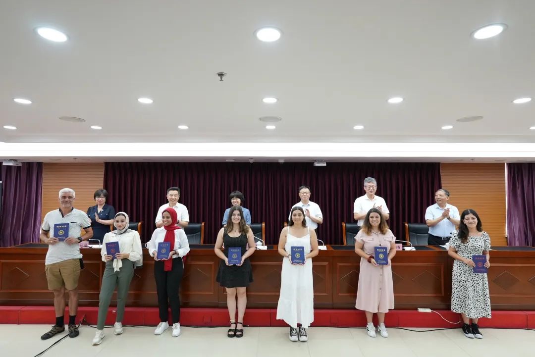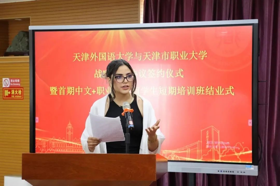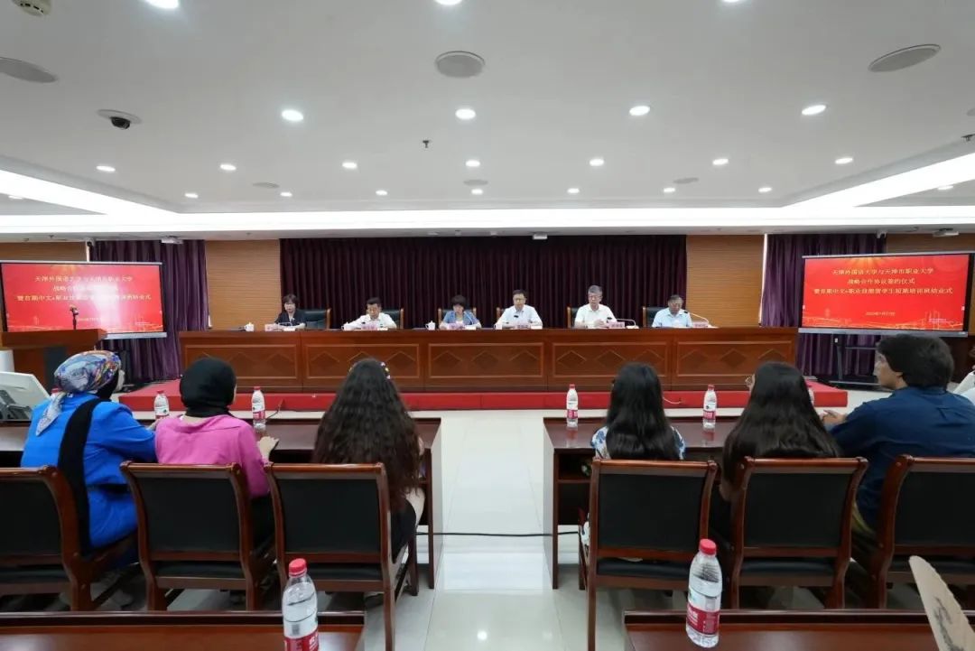 7月27日,天津外国语大学与beat365英国官方网站战略合作协议签约仪式暨首期中文+职业技能留学生短期培训班结业式在职业大学北辰校区举行。天津外国语大学党委书记周红蕾、校长陈法春、副校长李迎迎,beat365英国官方网站党委书记夏静波、校长郑清春、副校长李树岭,以及来自葡萄牙、埃及的31名留学生参加活动。