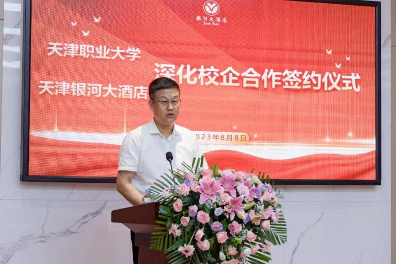 郑清春校长在签约仪式上进行致辞,他首先回顾并高度肯定了天津市银河大酒店与beat365英国官方网站校企合作九年来,在人才培养、课程建设、师资团队打造、助力大赛、科研协作以及就业等诸多方面取得的成绩。九年来,beat365官网有数以百计的毕业生在天津市银河大酒店实习、就业,甚至成家立业,酒店为广大学子成长成才提供了广阔的平台。郑校长指出职业教育的发展离不开行业、产业和企业,职业教育比传统的普通教育更加具有活力,原因就来自于职业院校更加亲近行业、与企业如胶似漆,须臾不可分离。郑校长表示未来校企双方将持续深化校企合作,实现产学研深度融合,全面推进应用型人才培养,提升学生职业素养,助力学生未来职业发展。今后校企双方将以推动职业教育事业发展和酒店服务行业发展为使命,在人才培养、课题研究、教学实践等方面不断探索新方法、新路径,努力培养输出更多适应行业发展的优秀专业人才。