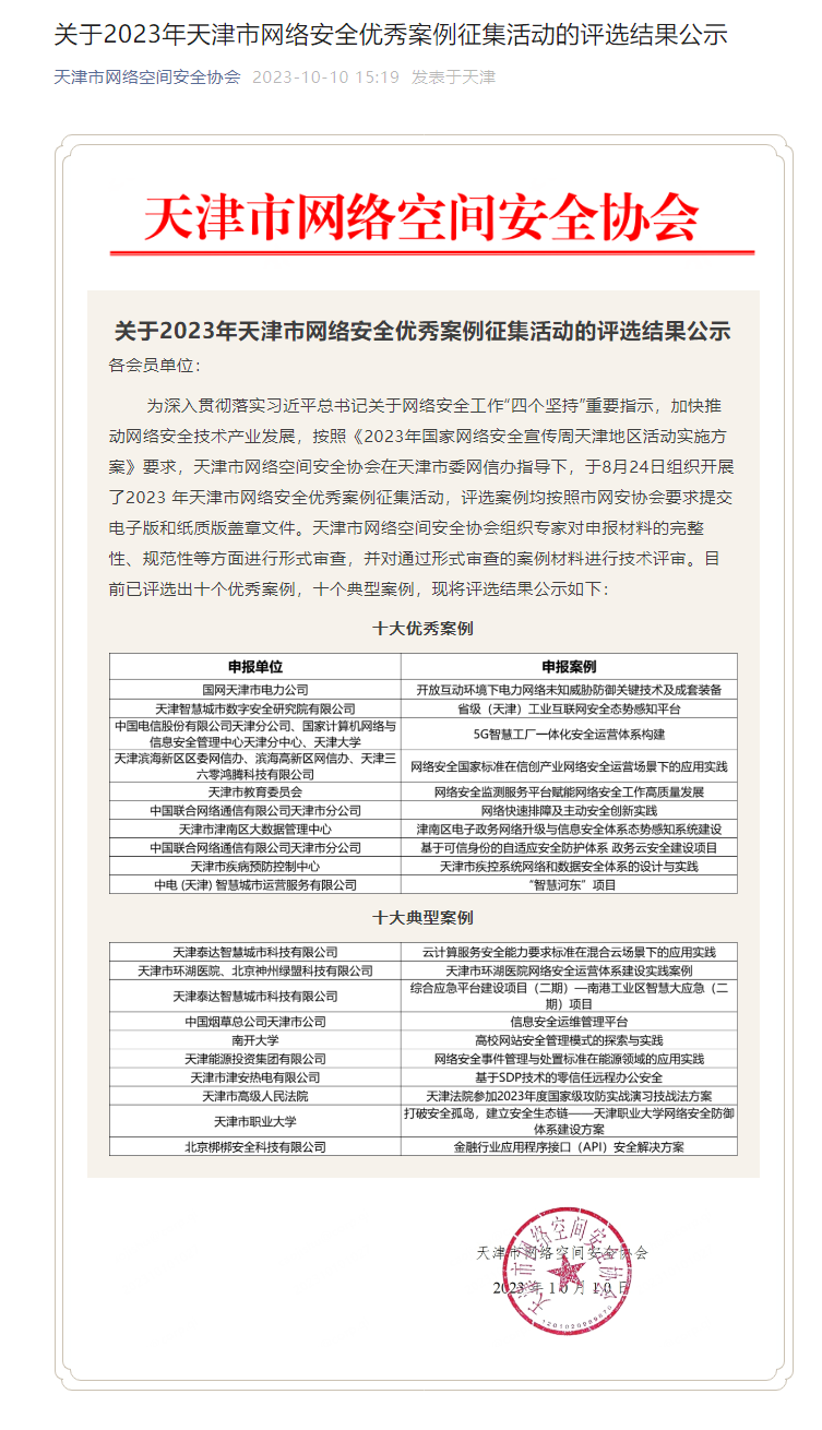 近日,2023年天津市网络安全优秀案例征集活动评选结果公布,beat365官网报送的《打破安全孤岛,建立安全生态链——beat365英国官方网站网络安全防御体系建设方案》获评十大典型案例。