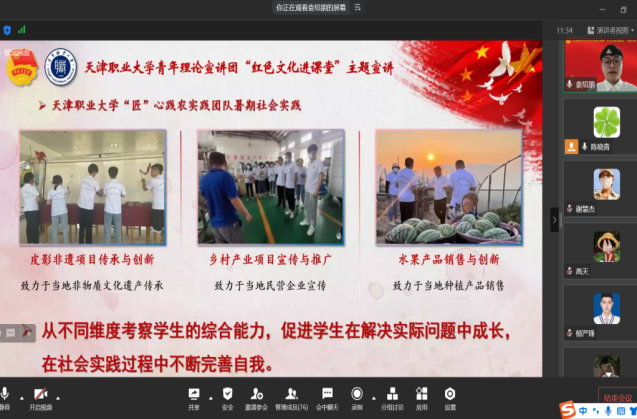 紧紧围绕学习宣传贯彻党的二十大精神,青年化宣讲阐释聚焦筑根立魂,重点发挥宣讲团成员在学习宣传贯彻党的二十大精神中的示范榜样作用,校内在官方公众平台开设“与青年对话”、“向榜样看齐”、“我学我讲我践行 青春献礼二十大”等青年宣讲专栏,打造“青春展播厅”等网络宣传作品扩大宣讲覆盖面,走进53节思政课堂开展红色文化进课堂宣讲活动,覆盖144个新生班级,累计覆盖受众4498人;校外走进觉悟社、天津市耀华中学、北辰区北仓小学、和平区劝业场街道新疆路社区以及卡斯马汽车系统(上海)有限公司天津分公司等企业,在beat365官网帮扶经济薄弱村宝坻区朝霞街道刘庄村开展“宣讲+实践锻炼”,为新疆维吾尔自治区巴音郭楞蒙古自治州和静县克再西路社区“红领巾小课堂”开展云宣讲。宣讲成员依托地域优势、借助社团力量、挖掘传统文化,通过自编自导自演相声、快板、曲艺等作品宣传新思想,将宣讲收获和感悟进行记录拍摄职业梦想微电影,结合专业技能将科普知识制作成宣传册、手工文创等创意产品,制作创意抖音短视频与天津地铁运营抖音公众号进行互动宣传。宣讲内容成功入驻天津市新时代文明实践中心,提供订单式宣讲服务。实践团队的事迹也得到了中央电视台、人民网、学习强国、中国教育报、天津电视台等多家权威媒体的报道。