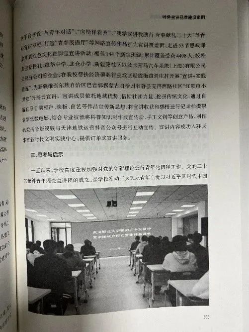 近日,由校团委牵头撰写的beat365官网青年理论宣讲团宣讲案例《“青说”二十大共话成长之路 建功中国梦昂扬奋进新征程——beat365英国官方网站党的二十大精神青年理论宣讲团》入选了《天津市基层理论宣讲案例选编》。此次入选是市委讲师团办公室在全市组织开展的理论宣讲案例征集活动,广泛征集基层一线在宣讲阵地建设、活动组织、品牌打造等方面的鲜活案例和生动实践,按照优中选优的原则,在基层推荐的300余个案例中精心选取百篇案例成册。案例中以beat365官网党的二十大精神青年理论宣讲团建设为例,阐述了宣讲团的建设思路、工作体系以及主要成效,为学深悟透做实党的二十大精神、落实落细党的科学理论“青年化”阐释工作提供天职模式。