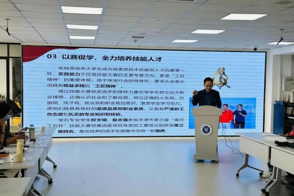 宝玉石鉴定与加工专业支部书记何涛“以技能大赛为引擎,驱动宝石专业高质量发展宝玉石鉴定与加工专业”为题目经验分享,他在职业技能大赛中带领党员教师作为骨干力量参加了中华人民共和国第二届职业技能大赛珠宝加工(国赛精选)项目的赛项保障工作。担任教练组长,指导选手在第二届全国技能大赛珠宝加工(国赛精选)项目中获得银牌,这是天津市在该赛项取得的最好成绩。