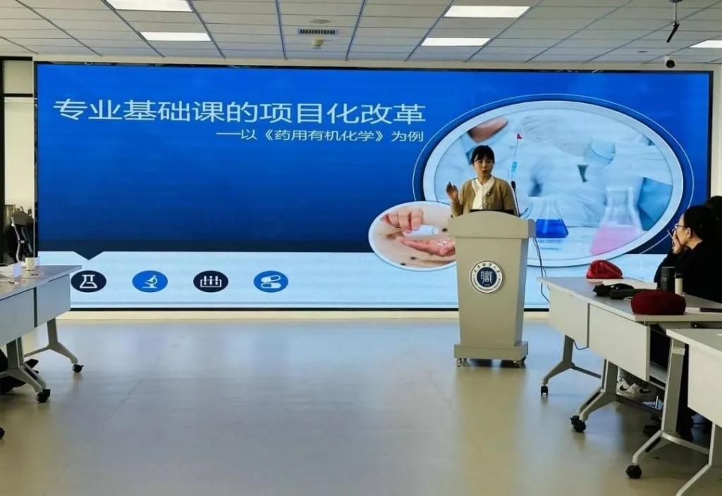全国职业院校教学能力比赛二等奖获得者李璐“以教学能力大赛为依托的课程设计药用有机化学”分享专业基础课项目化教学改革。