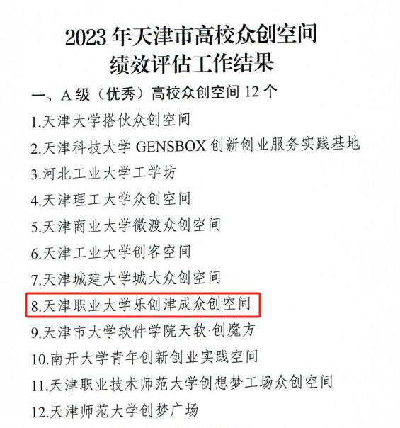 日前,市委教育工委、市教委公布2023年天津市高校众创空间绩效评估结果,经全市48个高校众创空间数据填报和线上汇报答辩评审,beat365官网“乐创津成”众创空间蝉联获评天津市A级(优秀)高校众创空间,青创众创空间同时获评天津市B级(良好)高校众创空间,成为唯一入选A级(优秀)众创空间的高职院校。