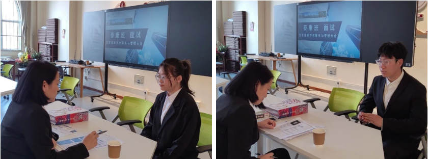座谈期间平行进行首批“泰康班”面试选拔工作。“泰康班”按照“人才共育、过程共管、责任共担、成果共享”的培养原则,采取“2+1”定制式人才培养模式。泰康之家·津园人力资源部负责人赵凤娜女士从岗位认知、职业规划、服务意识等方面对学生们进行全面了解和综合考量。