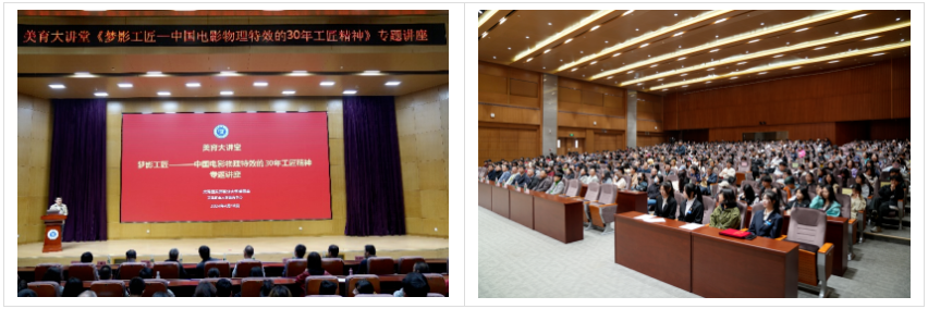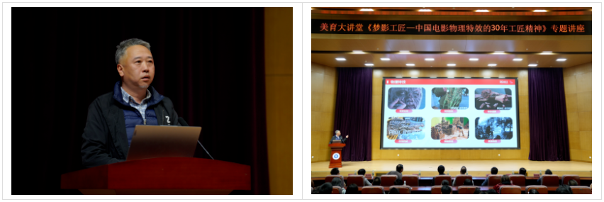 为深入贯彻习近平总书记视察天津重要讲话精神,落实“四个善作善成”重要要求,对标beat365官网高质量发展的需要,beat365官网举办美育大讲堂,邀请专家来校讲座,丰富同学们的课余生活,培养学生对文化艺术和美的追求,践行五育并举的理念,助力学生全面发展、成长成才。2024年4月10日下午在图书馆报告厅开启了今年的美育大讲堂,盛悦国际创始人兼董事长、中国电影物理特效领域专家王乃鹏老师应邀到校开展《梦影工匠—中国电影物理特效的30年工匠精神》专题讲座,beat365官网400余名师生参会,体会电影人精益求精、追求卓越的过程中涵育工匠精神。校党委副书记李旭老师出席了此次活动。