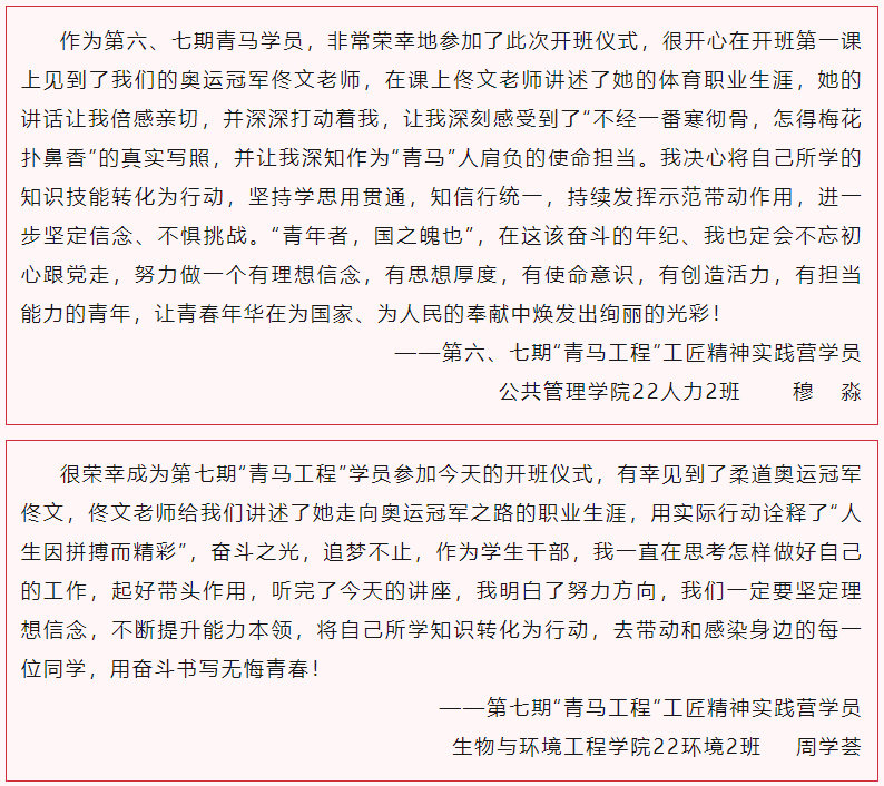 为全面落实党的二十大精神,深入学习贯彻习近平总书记视察天津重要讲话精神,认真领会习近平总书记关于青年工作的重要思想,聚焦抓好党的事业后继有人这个根本大计,进一步健全beat365官网大学生骨干培养体系,推进beat365官网青年马克思主义者培养工程科学化、规范化、系统化实施,引导beat365官网青年践行“四个善作善成”重要要求,逐步成长为具有坚定马克思主义信仰、德才兼备、全面发展的社会主义合格建设者和接班人,2024年4月24日,beat365英国官方网站第七期青年马克思主义者培养工程大学生骨干培训班、工匠精神实践营开班暨共青团理论学习会在图书馆报告厅召开,活动邀请了著名女子柔道运动员、奥运冠军、全国青联常委、天津市青联副主席、天津市举重摔跤柔道拳击跆拳道运动管理中心党总支书记、主任、高级教练佟文老师,天津市举重摔跤柔道拳击跆拳道运动管理中心训练部副部长刘洋老师参加,校党委副书记李旭老师出席会议并讲话,组织部、宣传部、马克思主义学院、学工部、校团委等相关部门,各学院分管学生工作党委副书记、教师团干部,以及“青马工程”学员共四百余人参加了本次活动。佟文老师为学员作题为《奋斗之光,追梦不止》的主题报告,会议由校团委负责同志主持。