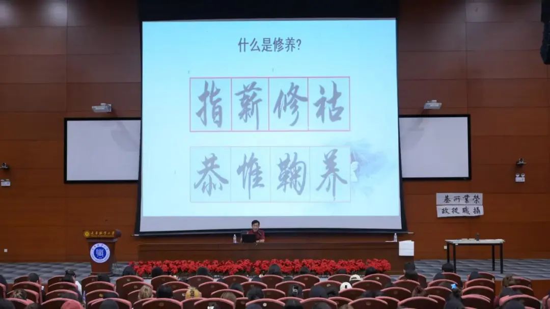 陈百川老师以“学习国学智慧,增强大学生修养”为题,用问题式情景教学的方式导入,用生动的语言和详实的案例,将听众带入了浓厚的国学氛围之中。他强调了国学在中华民族历史长河中的重要地位和深远影响,随后围绕《千字文》的形成过程、行文逻辑、蕴含的哲理进行了详细阐述,并重点介绍了《千字文》独有的文字优美、内容丰富、哲理深刻、结构严谨、韵律和谐以及书法艺术价值高六个方面的特色。为了让师生们更直观地感受《千字文》的书法艺术价值,陈百川老师现场进行了书法展示。他挥毫泼墨,一气呵成,写下了精美的书法作品并将书法作品赠送给了在场的同学,并鼓励同学们深入学习国学文化,传承和弘扬中华优秀传统文化,深切感受中华优秀传统文化的博大精深,认识到国学文化的魅力所在,增强对传统文化的认同感和自豪感。