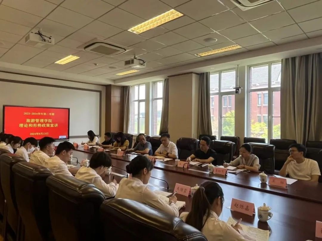 为深入学习贯彻习近平总书记对学校思政课建设作出的重要指示精神,6月13日,校党委书记夏静波同志与旅游管理学院学生代表深入座谈并讲授形势与政策课。校办主任、旅游管理学院领导班子成员、学生代表参加,会议由旅游管理学院党委书记诸杰同志主持。