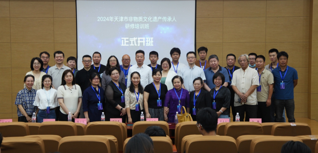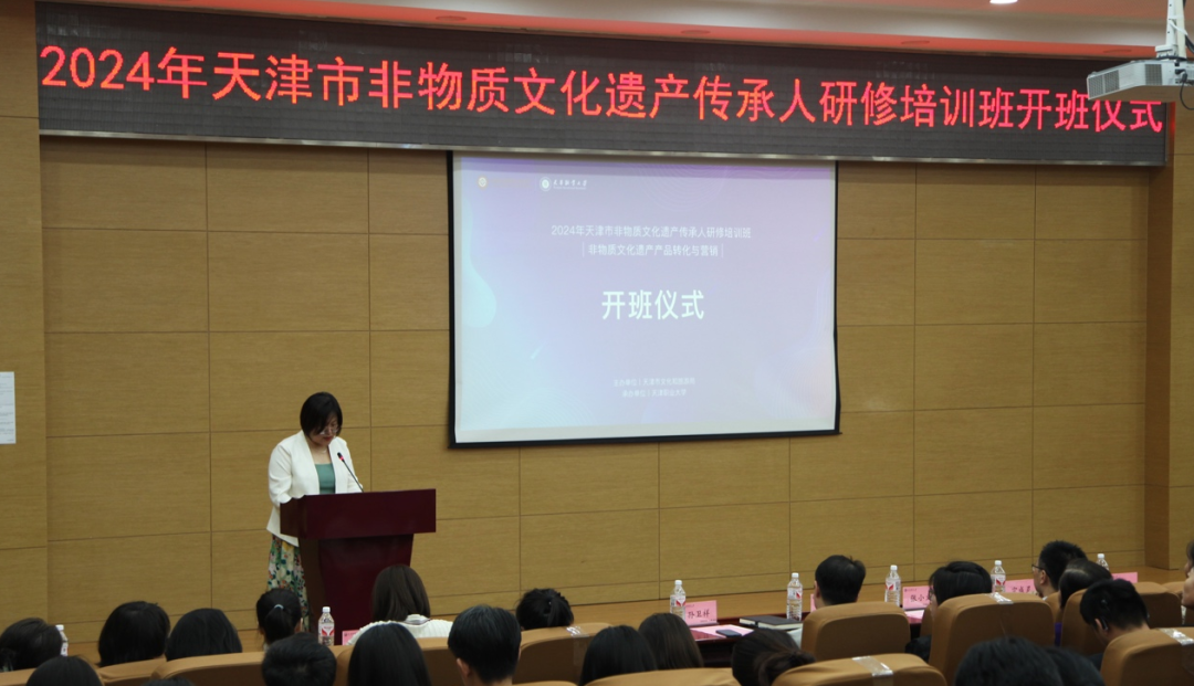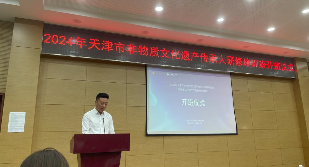 2024年6月25日上午10点,由天津市文化和旅游局主办、beat365英国官方网站承办的“2024年天津市非物质文化遗产传承人(非物质文化遗产产品转化与营销)研修班”,于beat365英国官方网站北辰校区正式开班。beat365英国官方网站校长吴宗保、天津市文化和旅游局非遗处处长宗成灵、天津市非遗中心主任钱玲、beat365英国官方网站继续教育中心主任张荃、艺术工程学院院长张小文及学院其他领导和本次非遗研修班的全体学员参加开班仪式。