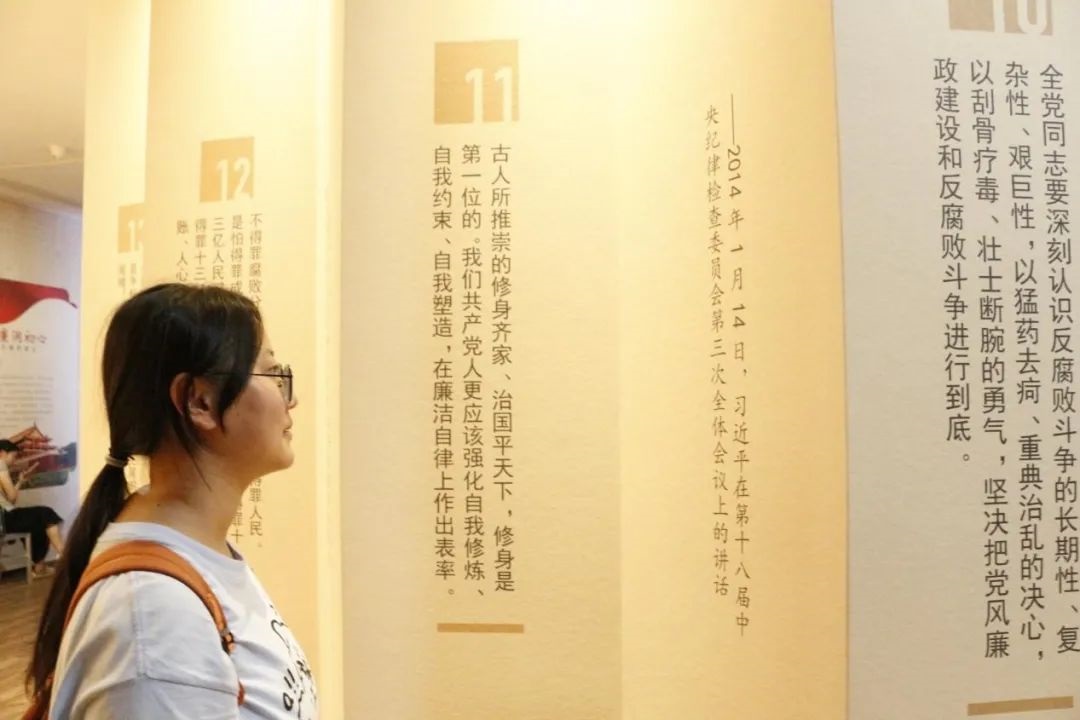 展馆的一至三层分别以铜镜、翠竹、玉石这三类事物层层展现中国古代廉政制度文化、思想文化、行为文化,展现了中国传统文化中的廉洁元素,让师生党员充分感受到了中华民族崇廉尚洁的千年文化与精神的代代传承。行至第四层,带着对古代廉文化地思考,翻阅相关书籍、交流学习体会,师生党员深刻感悟了中国共产党在新的征程中推动全面从严治党向纵深发展的决心。