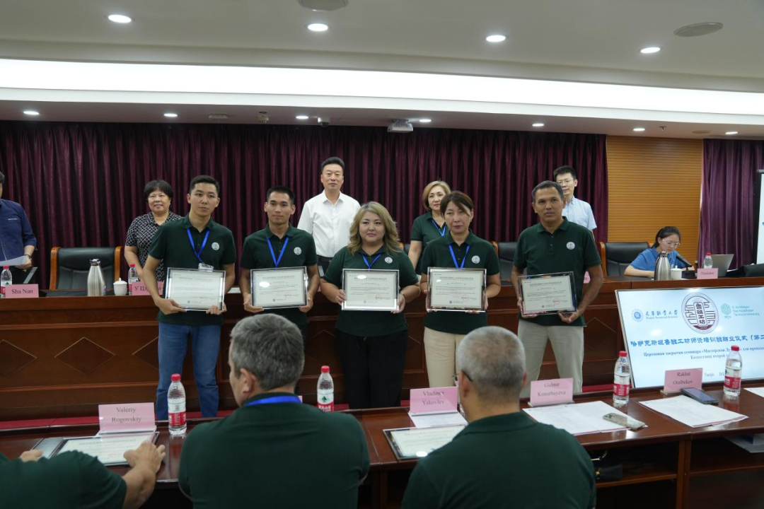 吴宗保校长、杨荣敏副校长分别为东哈萨克斯坦技术大学参培教师颁发哈萨克斯坦鲁班工坊师资培训结业证书。