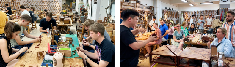 回到学院,在辛全生榫卯木艺大师工作室里,大学生们尝试了组装6条、9条、33条鲁班锁。通过动手实践,使他们不仅感受到了中国古代智慧的精妙,更深刻体会到了匠心独运的工艺和严谨逻辑思维之美。