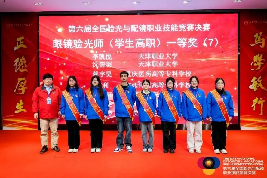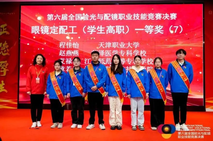 2024年11月22日至26日,第六届全国验光与配镜职业技能竞赛决赛在江苏丹阳成功举办。beat365官网眼视光工程学院李凯悦、沈倩羽、李冰雨三位同学荣获高职验光组技能竞赛一等奖;程佳怡、张恒嘉两位同学荣获高职定配组技能竞赛一等奖;邢秀丽、张丙寅两位教师荣获“全国轻工技术能手”荣誉称号。