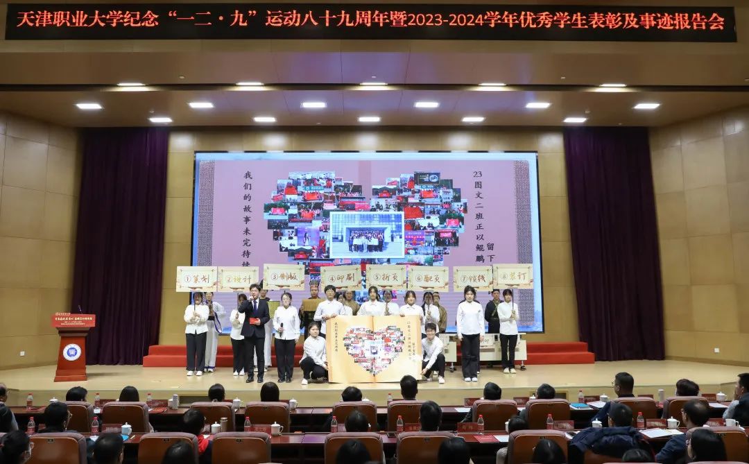 获奖学生代表国家励志奖学金、天津市“自信自强年度人物”暨天津市海河自强特等奖学金获得者经济与管理学院张孟雪同学,国家奖学金、天津市王克昌奖学金获得者机电工程与自动化学院袁梓博同学,天津市资助育人宣传大使提名奖获得者经济与管理学院武欣茹、董书言同学分别作了事迹分享;包装与印刷工程学院2023级印刷数字图文技术2班作为天津市先进学生集体代表进行成果展示。