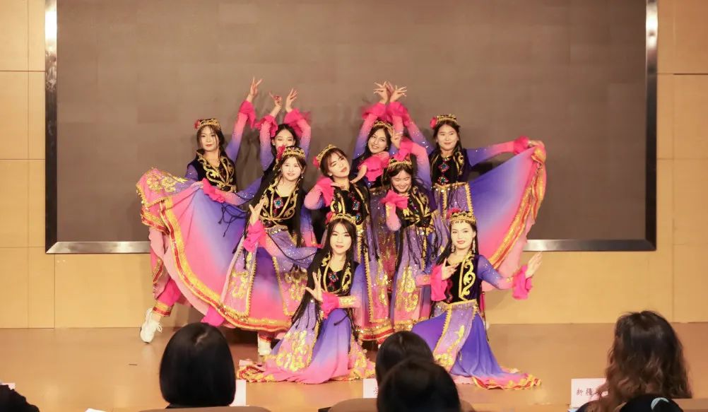 旅游学院舞者再绽芳华,带观众神游大美新疆。舞台幻为西域胜境,舞者身姿婀娜如天山雪莲,旋转跳跃间,戈壁浩渺、雪峰巍峨、草原葱郁、湖泊潋滟铺展眼前。欢快舞步、飞扬裙袂,洋溢着学生们的青春活力,展现了多民族文化共荣的美好景象。