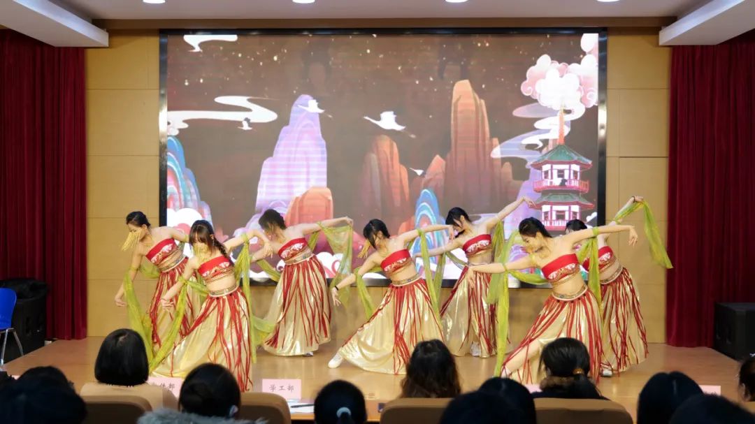 活动以轻盈舞姿拉开帷幕,旅游学院的舞者们似彩云飘然而至。《云想霓裳》灵感源于盛世大唐的霓裳羽衣舞,舞者衣袂飘飘,水袖翻飞,演绎宫廷绮梦与盛世风华。每一步流转、每一回顾盼,皆重现古代乐舞精妙神韵,带观众穿越时空,领略唐宫夜宴的奢华与浪漫,令人沉醉于历史文化的深厚底蕴。