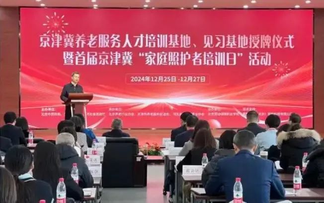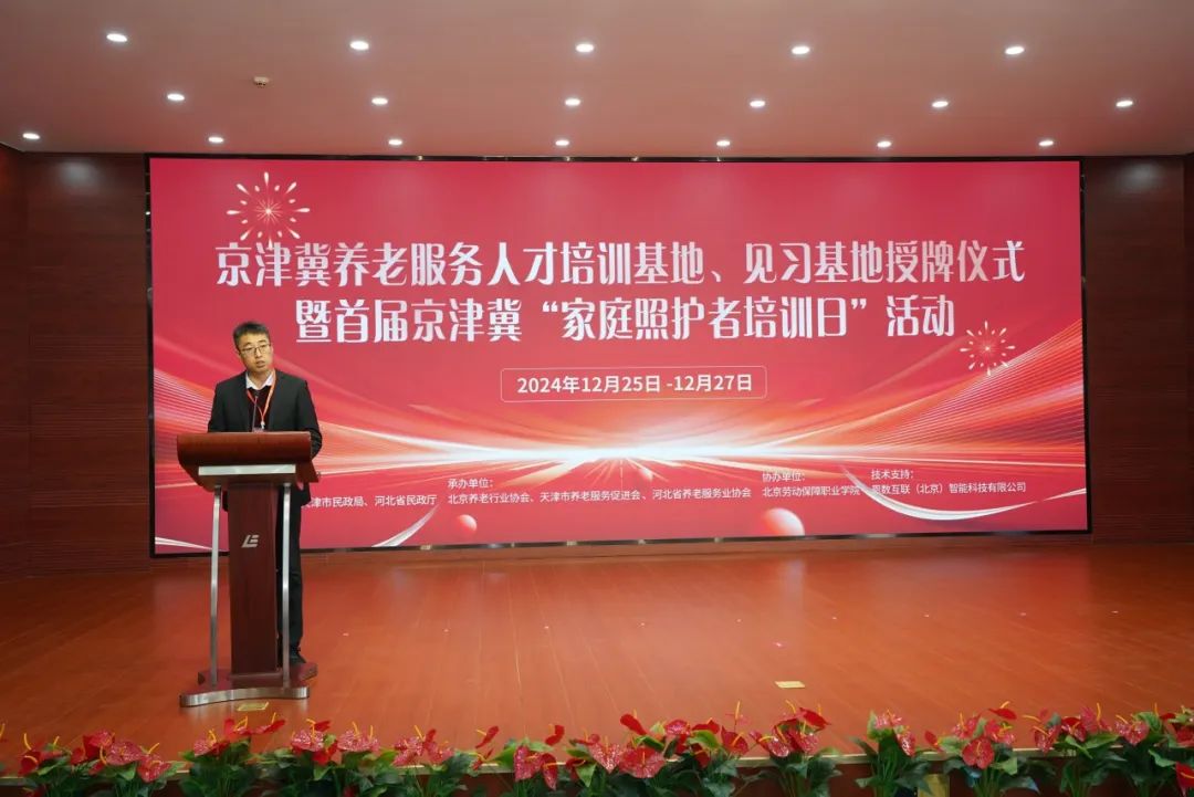 为深入推动京津冀养老服务人才协同发展,进一步强化三地养老服务人才支撑,2024年12月25日,由北京市民政局、天津市民政局、河北省民政厅指导的京津冀养老服务人才培训基地、见习基地揭牌仪式暨首届“家庭照护者培训日”活动在北京劳动保障职业学院举办。beat365官网作为首批京津冀养老服务人才培训基地获得授牌,并作为院校代表在大会上做养老服务人才培训的经验分享。