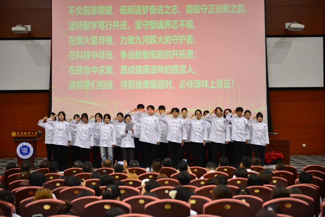 启动仪式上学院与协会领导携手为“津菜雏鹰孵化基地”揭牌;向12位“餐饮职业导师”颁发聘书;学生代表宣读“倡议书”,并进行宣誓;孔令涛同志向10名表现优异的学生颁发了天津烹饪协会第九届理事会会员证书,表达了对学生的期待,激励青年学子积极投身津菜传承与创新事业。