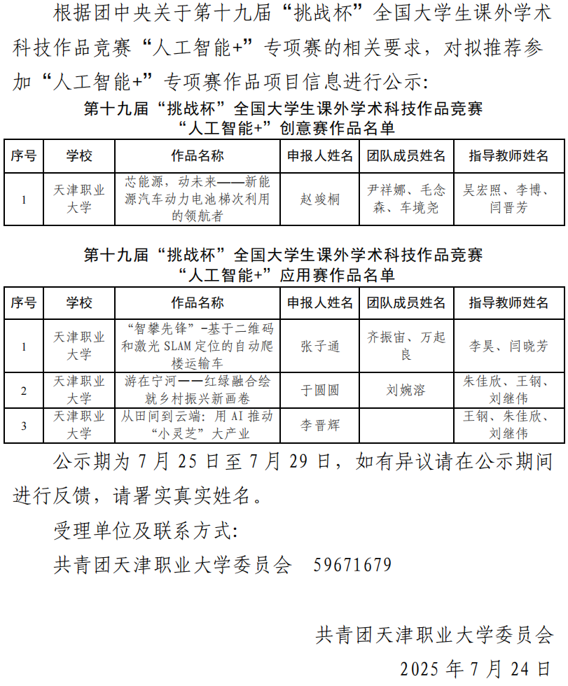 关于拟推荐参加第十九届“挑战杯”全国大学生课外学术科技作品竞赛“人工智能+”专项赛作品名单公示