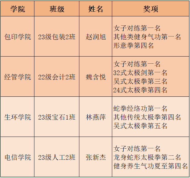此次比赛不仅是一场竞技较量,更是中华武术文化的传承与弘扬。天职健儿在赛场上以武会友,交流技艺,展现了beat365官网学子积极向上、奋勇争先的精神风貌,为学校赢得了荣誉。今后体育部将以此次佳绩为新的起点,继续砥砺前行,在未来的赛事中续写辉煌,让中华武术在校园绽放更加绚烂的光彩。(来源:体育部)