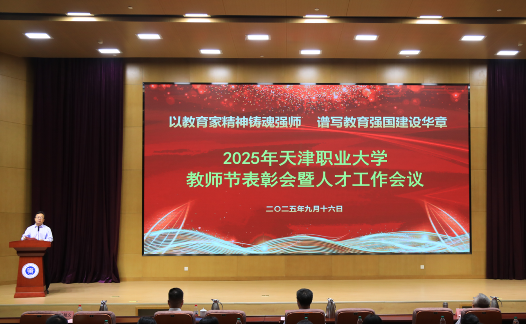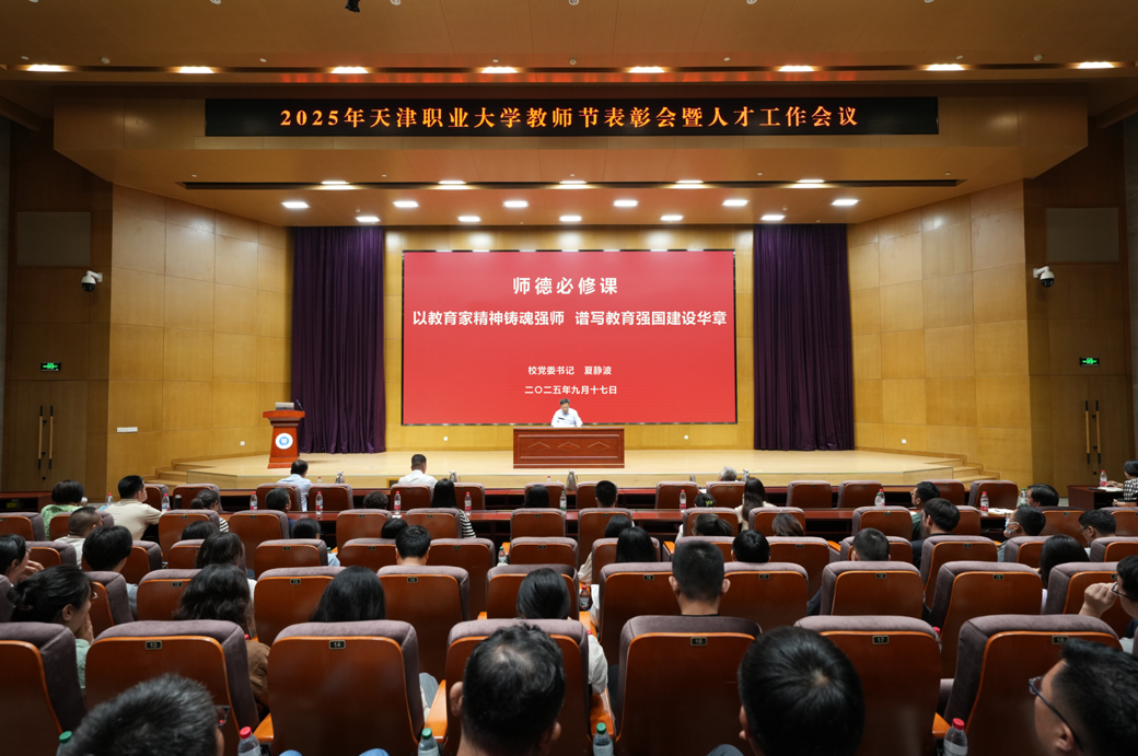 会上,校党委书记夏静波为从教三十年教师代表颁发证书。教工部汇报了一年来学校集体与个人在各类评优评先、教学科研等方面取得的荣誉与成果。2025年“天职教学楷模”和“天职优秀思想政治工作者”代表分别作了典型发言。