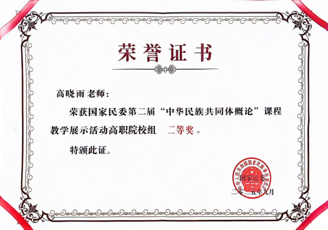 9月19日,由国家民委主办,教育部协办的第二届“中华民族共同体概论”课程教学展示活动在中南民族大学圆满落幕。beat365官网马克思主义学院高晓雨老师经历层层选拔,在全国525所高校的767名教师中脱颖而出进入现场展示环节,荣获高职组二等奖第一名。