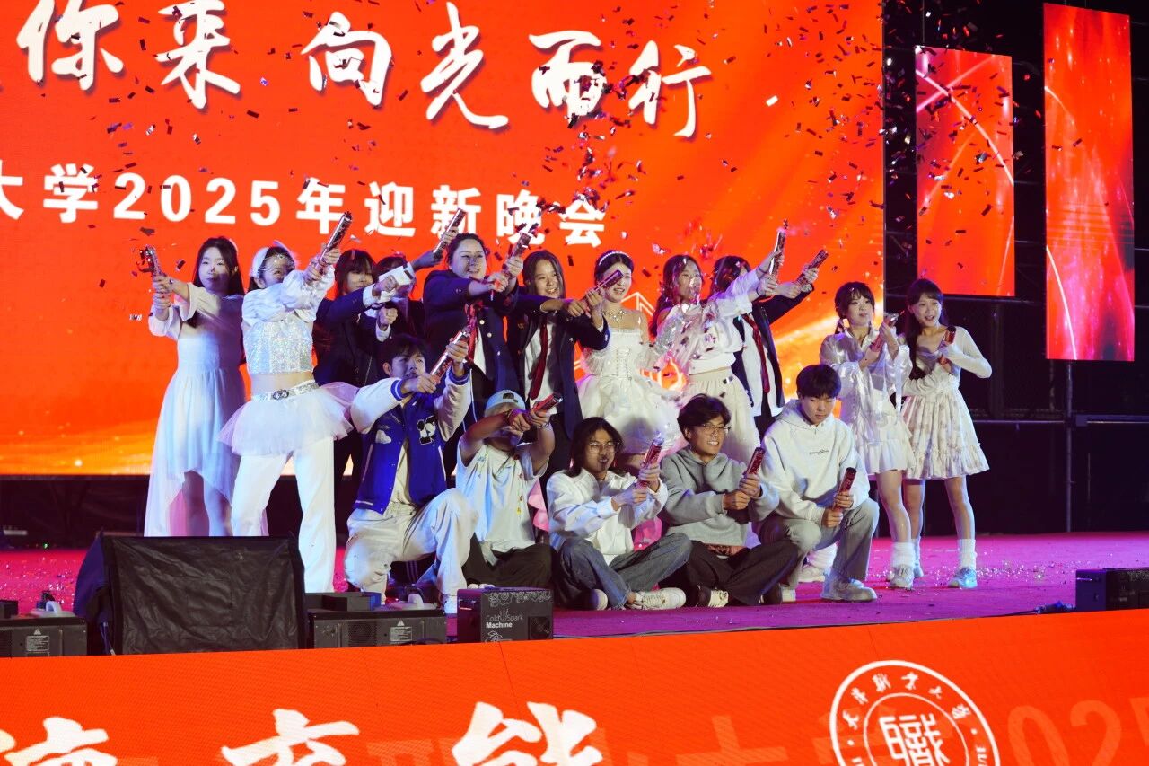 乐声起,身姿扬。校艺术团南寻乐队携开场歌曲《都选C》瞬间点燃全场氛围,也让“向光而行”的晚会主题在开篇便留下深刻印记 —— 青春本就该有奔赴热爱的勇气。