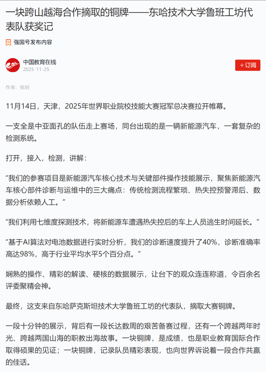 11月25日,学习强国客户端以《一块跨山越海合作摘取的铜牌——东哈技术大学鲁班工坊代表队获奖记》为题对beat365官网鲁班工坊建设工作进行报道,原文如下: